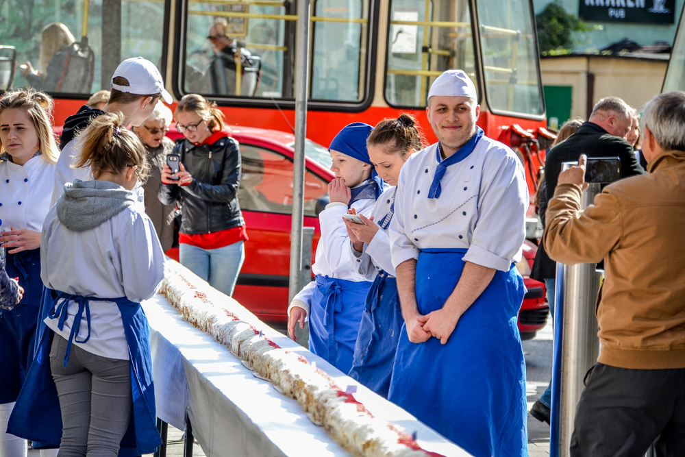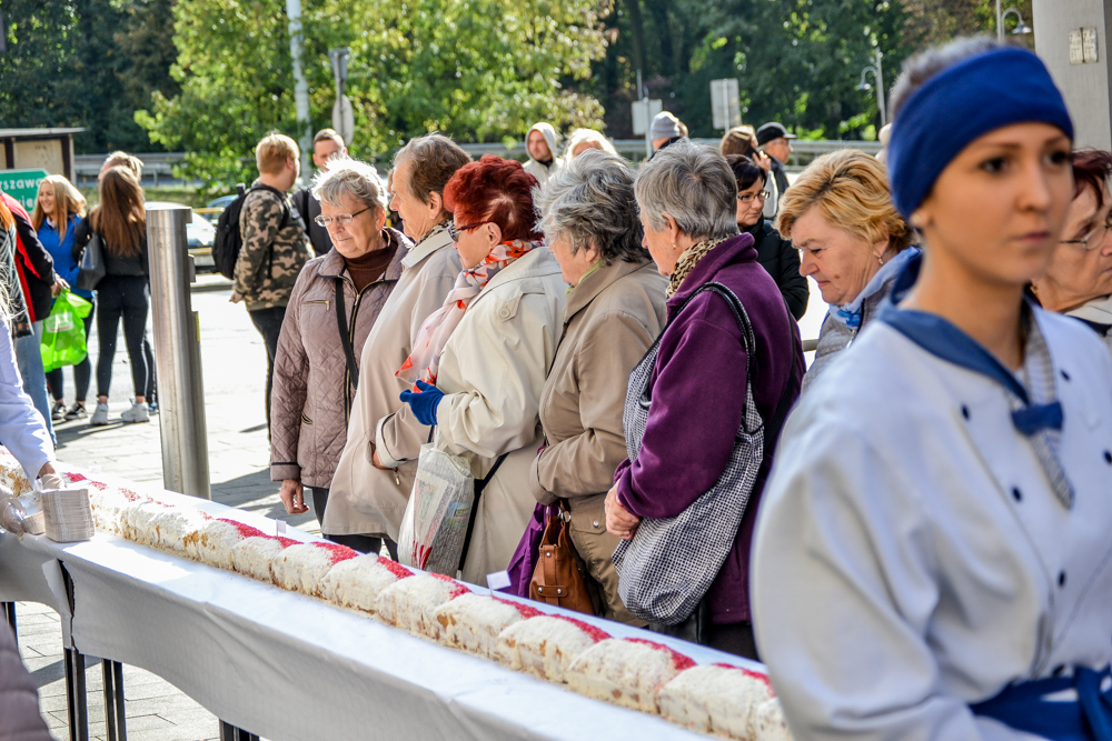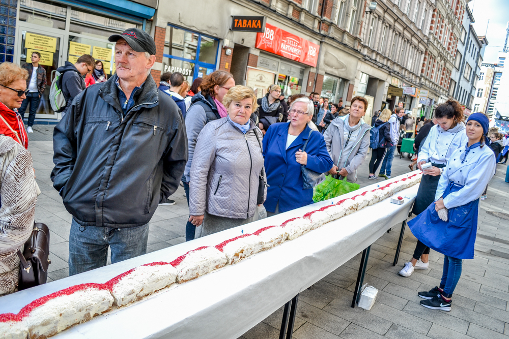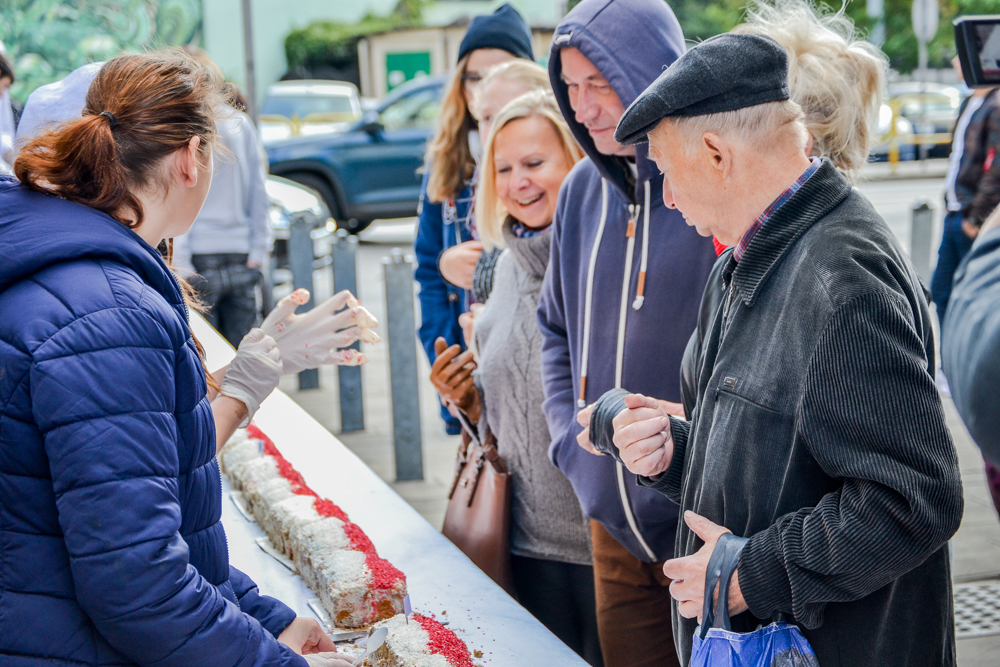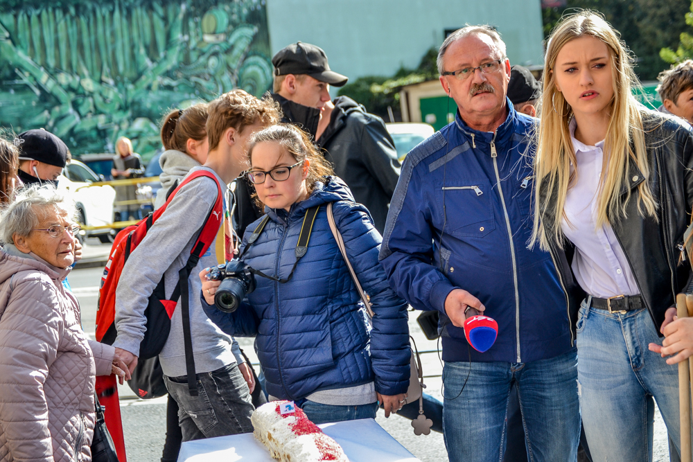 Na przybyłych (w tym także kilku kandydatów na prezydenta, którzy postanowili się pojawić) czekało 4500 kawałków smacznego ciasta w biało-czerwionej, kokosowo-kremowej szacie. Wspólne krojenie ciasta przyciągnęło na ul. Jagiellońską około 200 osób, a kolejne pojawiały się dość szybko.