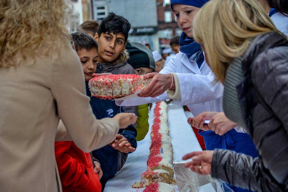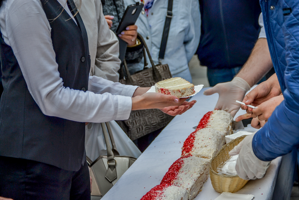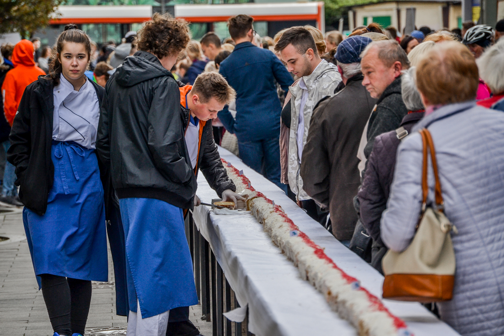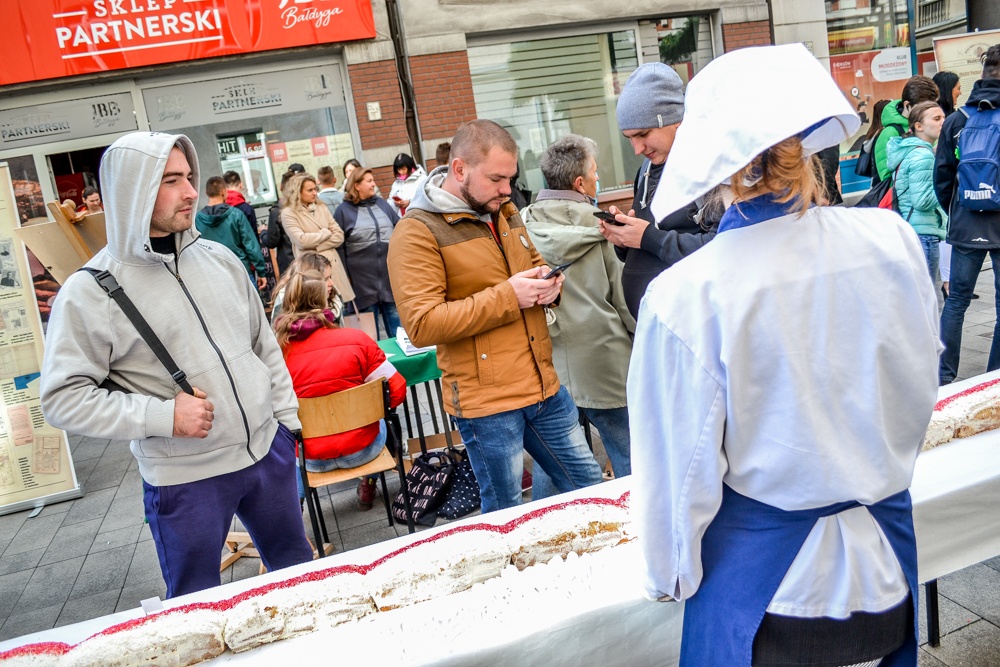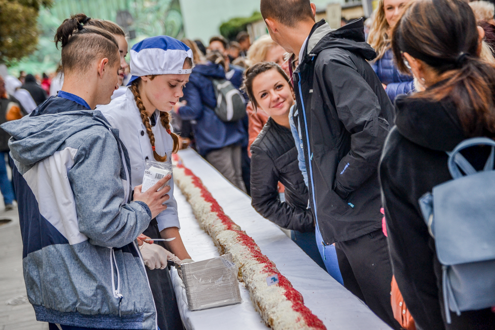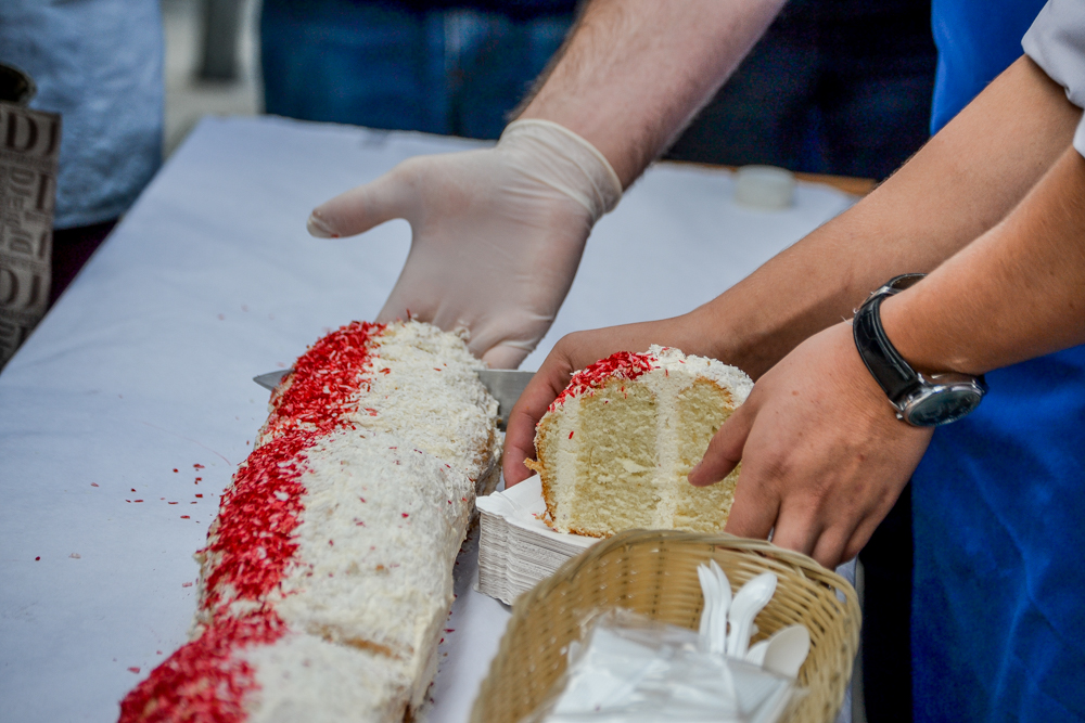 Na przybyłych (w tym także kilku kandydatów na prezydenta, którzy postanowili się pojawić) czekało 4500 kawałków smacznego ciasta w biało-czerwionej, kokosowo-kremowej szacie. Wspólne krojenie ciasta przyciągnęło na ul. Jagiellońską około 200 osób, a kolejne pojawiały się dość szybko.