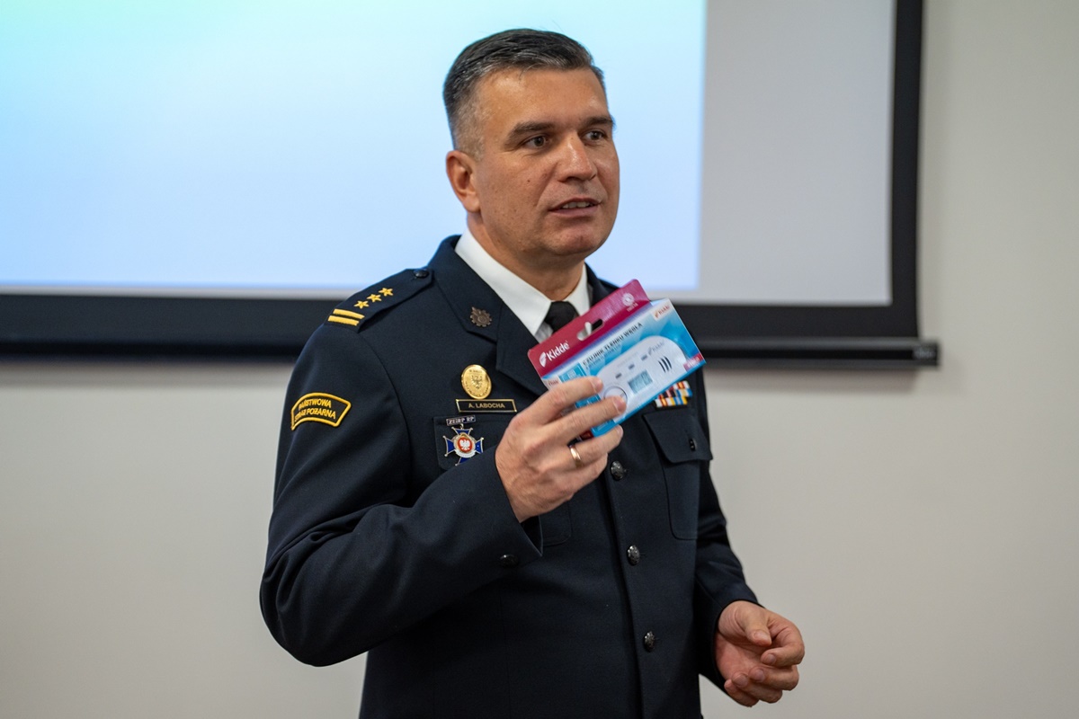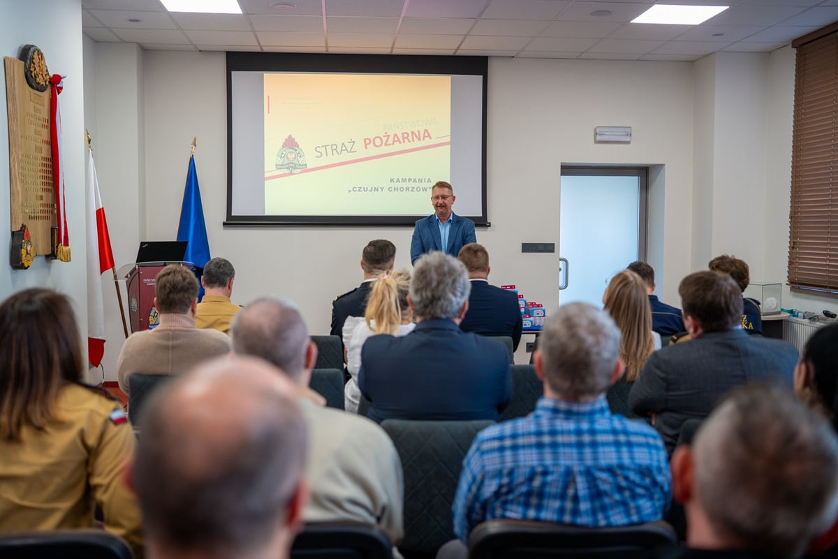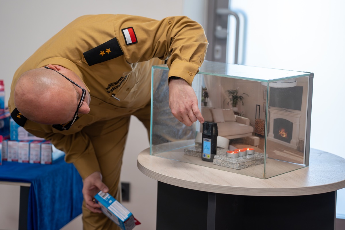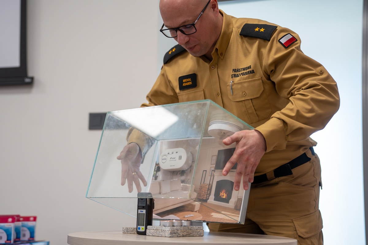 Spotkanie rozpoczęło się prelekcją na temat zagrożeń związanych z zatruciem tlenkiem węgla, którą poprowadzili Zastępca Dowódcy Jednostki Ratowniczo-Gaśniczej oraz Kierownik Sekcji Kontrolno-Rozpoznawczej. Uczestnicy mieli okazję zapoznać się z danymi dotyczącymi interwencji związanych z tym niebezpiecznym gazem oraz z zasadami prawidłowego montażu i funkcjonowania czujek tlenku węgla. Prelekcję wzbogacił praktyczny pokaz, który ukazał, jak właściwie korzystać z tych urządzeń.