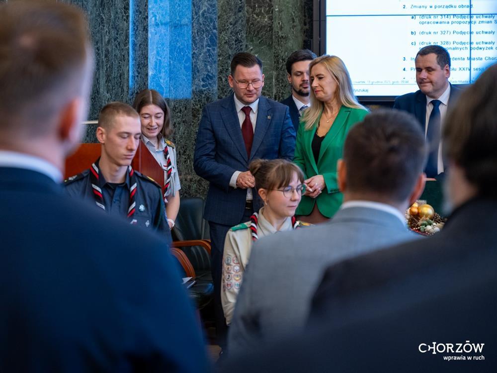 Wyjątkowym akcentem rozpoczęły się wczorajsze obrady Rady Miasta Chorzów. Harcerze z Hufca ZHP Chorzów uroczyście przekazali Betlejemskie Światło Pokoju na ręce Radnych oraz Zarządu Miasta, przypominając o wartościach, które w świątecznym czasie wybrzmiewają szczególnie mocno.