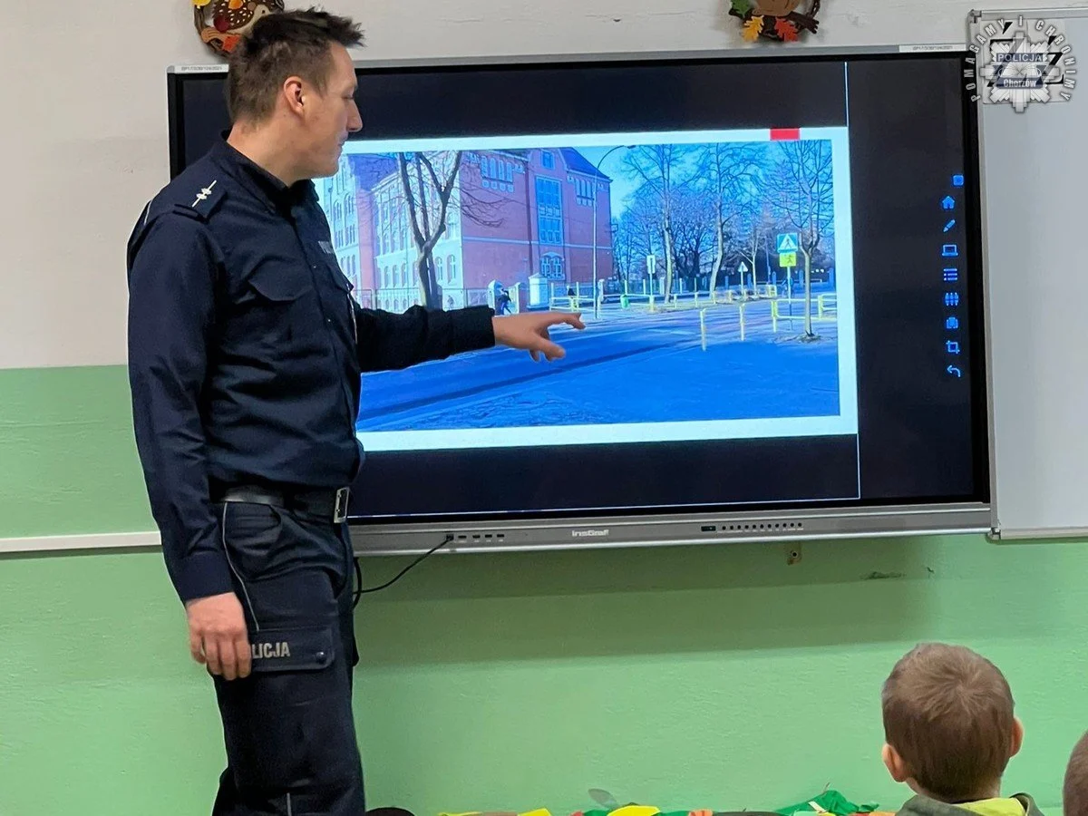 Policjanci rozpoczęli spotkanie od omówienia kluczowych zasad bezpieczeństwa podczas drogi do szkoły. Przypomnieli dzieciom, jak prawidłowo przechodzić przez jezdnię: zawsze na pasach i po upewnieniu się, że nadjeżdżające pojazdy się zatrzymały. Uczniowie dowiedzieli się także, dlaczego warto nosić odblaski – szczególnie w okresie jesienno-zimowym, gdy widoczność na drodze jest ograniczona.
