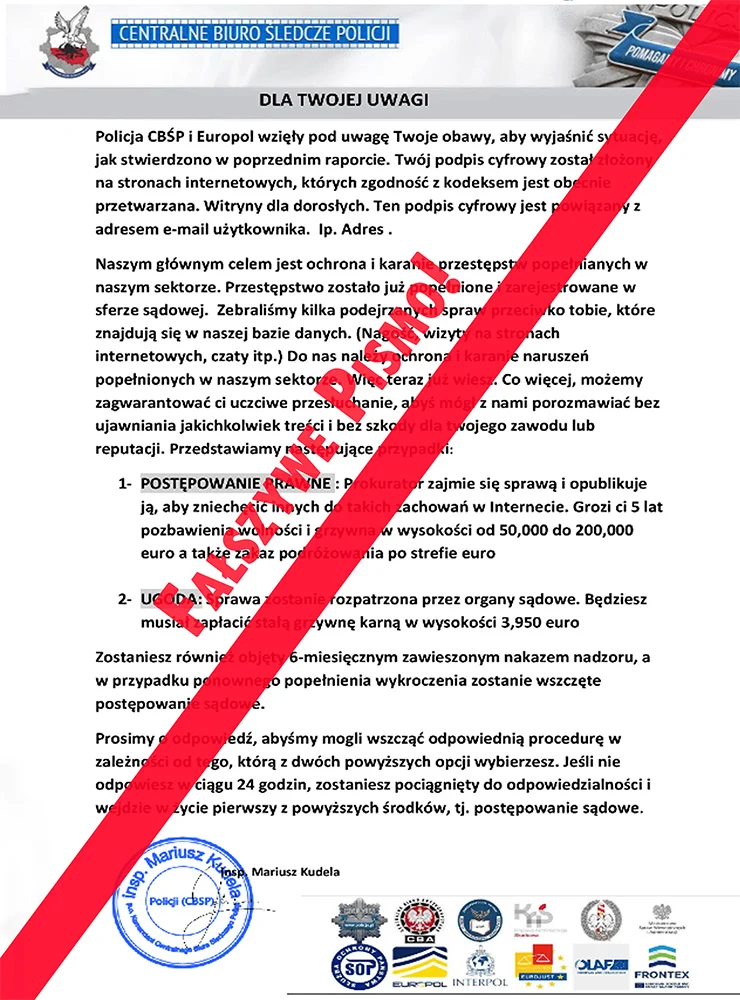 W celu uwiarygodnienia swojej wiadomości oszuści załączają plikrozpoznawany jako dokument w formacie „pdf”, w którym podpisują się jako Komendant Centralnego Biura Śledczego Policji, inspektor Cezary Luba lub inspektor Mariusz Kudela aktualny Zastępca Komendanta Wojewódzkiego Policji w Krakowie.