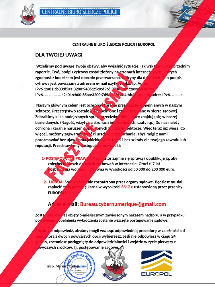 Cała korespondencja w rzeczywistości jest próbą oszustwa i zastraszenia odbiorcy. Jej celem może być kradzież naszych danych czego konsekwencją, może być utrata naszych pieniędzy.
