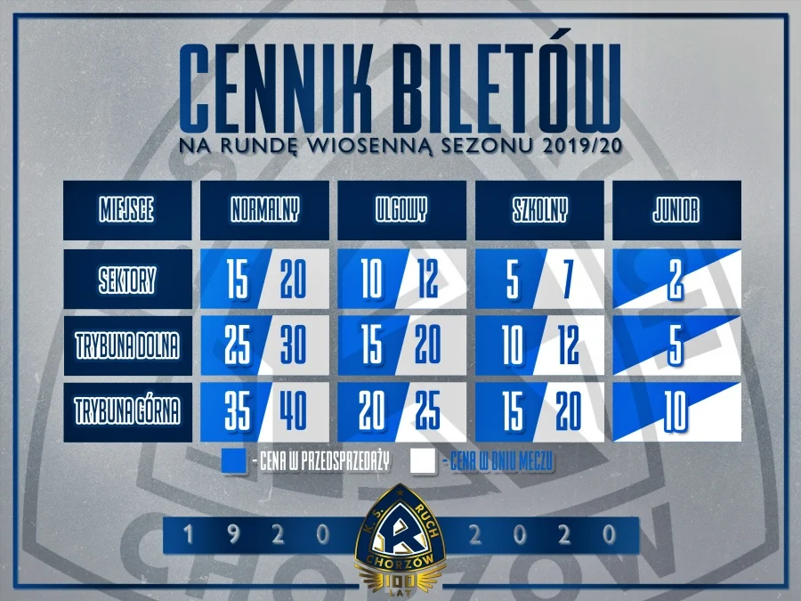 Ceny biletów na domowe mecze Ruchu Chorzów są stałe, ale premiowani będą kibice, którzy wcześniej zakupią wejściówki. W dniu meczu bilety będą droższe. Najtańszy bilet na mecz Niebieskich w rundzie wiosennej kosztuje 2 zł – przysługuje on dzieciom, które nie ukończyły 14 lat i upoważnia do wejścia na sektory, a najdroższy to bilet normalny na górną trybunę i jest w cenie 40 złotych. Pełny wykaz cen prezentujemy na grafice poniżej.