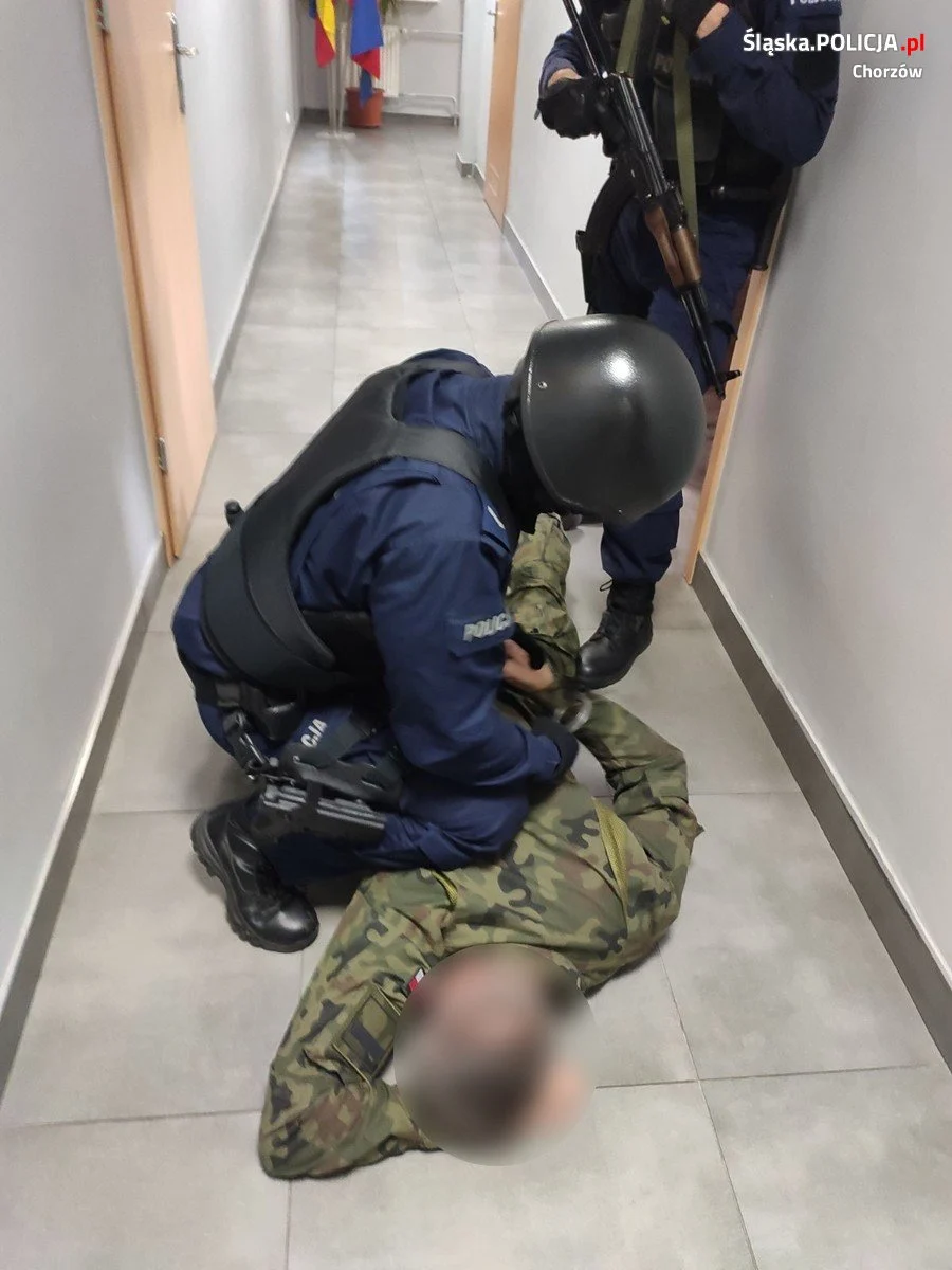 Przedwczoraj rano oficer dyżurny otrzymał wiadomość o strzelaninie na terenie Wojskowego Centrum Rekrutacjiw Chorzowie. Pozorowane naruszenie systemu ochrony przez wojskowego strzelca, to scenariusz wspólnych ćwiczeń. Skierowani na miejsce policjanci, przed przyjazdem zostali uzbrojeni w niezbędny sprzęt. Zabrali ze sobą hełmy i długą broń.