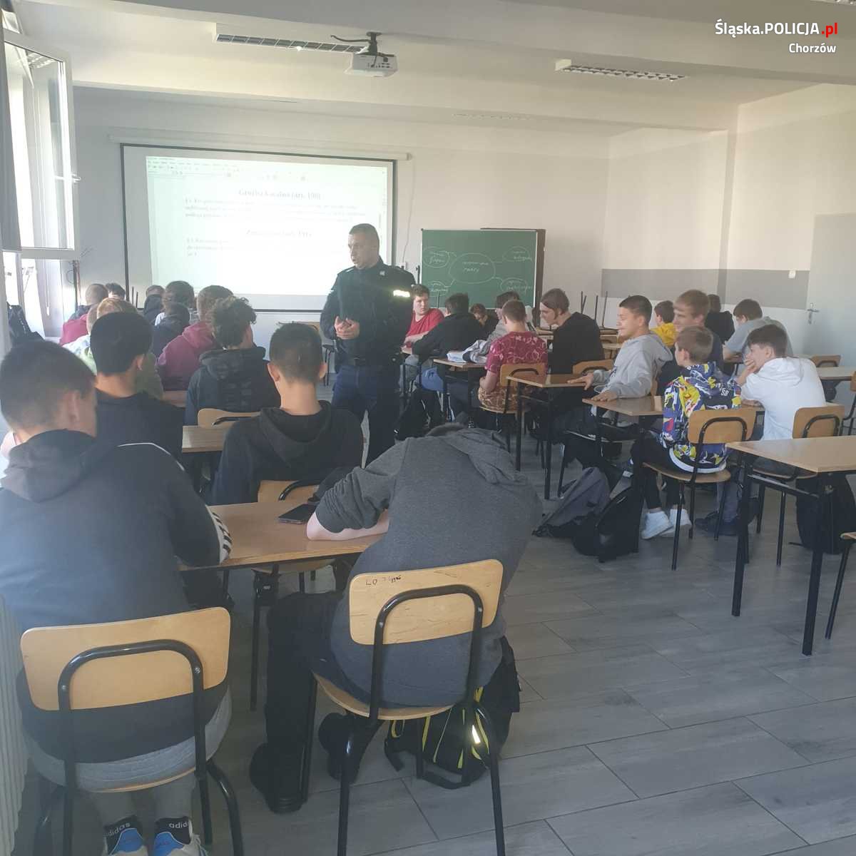 Chorzowscy policjanci zajmujący się działaniami w zakresie profilaktyki społecznej przeprowadzili niezwykłe zajęcia dla młodzieży z Zespołu Szkół Technicznych nr 1 w Chorzowie. Ich celem było przybliżenie uczniom pojęcia „Handlu Ludźmi”, charakterystyki tego zjawiska, wskazanie grup ryzyka, formy wykorzystania, sposobu działania sprawców takich przestępstw. Zwrócono również uwagę na uprawnienia ofiar Handlu Ludźmi. Policjanci przedstawili dodatkowo zagrożenia związane z przestępstwami w cyberprzestępczości oraz czynów określanych jako „Mowa nienawiści”. Zwrócono również uwagę na zagrożenia związane z przestępczością narkotykową. Spotkanie z młodzieżą miało na celu pogłębienie wiedzy w prezentowanym zakresie, zmianę wyobrażenia młodzieży w kwestii wymienionych zagrożeń, sposobu unikania sytuacji niebezpiecznych. Na zakończenie policjanci przedstawili charakter pracy policjanta oraz funkcjonowania Policji w Polsce. Zajęcia cieszyły się ogromnym zainteresowaniem, a młodzież zadawała policjantom szereg pytań. Spotkanie edukacyjne było okazją do promowania służby w Policji i zachęcania młodych ludzi do wyboru tego zawodu.