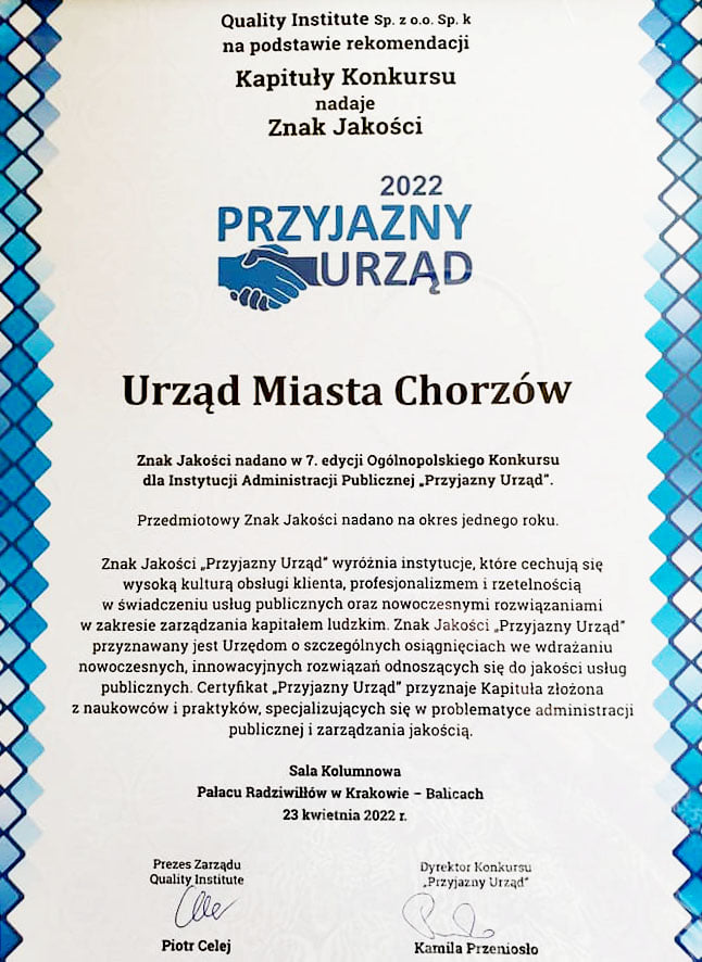 Już po raz drugi jury złożone z ekspertów i praktyków administracji publicznej uznało, że Urząd Miasta w Chorzowie cechuje wysoka kultura pracy, jakość w relacjach z interesantami, profesjonalizm i rzetelność. Dostrzeżono m.in. starania o sprawną i bezpieczną obsługę mieszkańców podczas pandemii oraz wprowadzenie narzędzi informatycznych pozwalających uprościć i przyspieszyć wiele urzędowych procedur.