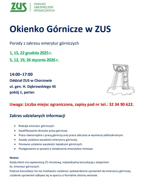 „Okienko górnicze” to dodatkowa usługa w Oddziale ZUS w Chorzowie realizowana od 2018 r. Konsultacje w ramach „Okienka górniczego” odbywały się w każdy pierwszy, roboczy poniedziałek miesiąca, w godzinach od 14.00 do 17.00. W grudniu tego roku i w styczniu 2026 r. częstotliwość będzie większa, natomiast od lutego 2026 r. powróci do dotychczasowej regularności – czyli pierwszy, roboczy poniedziałek miesiąca. „Okienko górnicze” skierowane jest do górników oraz ich rodzin. Z konsultacji korzystają także pracownicy kadr, którzy zajmują się kompletowaniem dokumentacji i wniosków o emeryturę dla zatrudnionych na kopalniach górników. Wyjaśnienie wątpliwości z przedstawicielami kopalń, czy doprecyzowanie niektórych spraw podczas takich konsultacji, ułatwia obsługę wniosków o emeryturę górniczą, co ma wpływ na szybsze wydanie decyzji.
