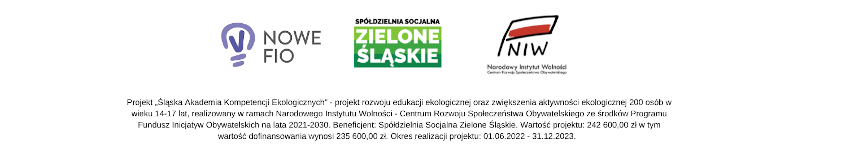 Projekt Śląska Akademia Kompetencji Ekologicznych realizowany jest w ramach Narodowego Instytutu Wolności – Centrum Rozwoju Społeczeństwa Obywatelskiego ze środków Programu Fundusz Inicjatyw Obywatelskich na lata 2021-2030.