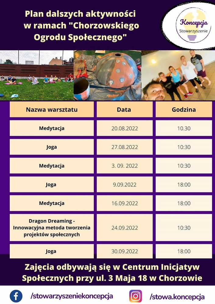 “Chorzowski Ogród Społeczny” trwa, a Stowarzyszenie Koncepcja właśnie ogłosiło plan, jakie aktywności są zaplanowane do końca września. Organizatorzy zapraszają na bezpłatne zajęcia rozwoju osobistego z jogi i medytacji. Zaplanowane zostały również specjalnego warsztaty – Dragon Dreaming, który jest innowacyjną, holistyczną metodą tworzenia pomysłów/projektów.
