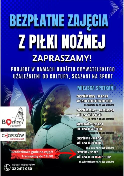 Bezpłatne treningi piłki nożnej i zajęcia ogólnorozwojowe w ramach Budżetu Obywatelskiego zostały wydłużone w SP1. We wtorki i czwartki uczestnicy mogą ćwiczyć teraz aż do godziny 19:30.