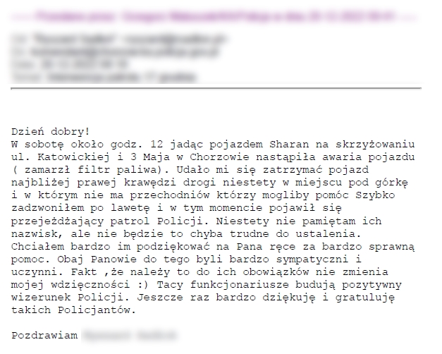 Pierwsze z podziękowań dotyczy okresu, gdy na Śląsku panował silny mróz. Jednemu z kierujących podczas jazdy niespodziewanie zepsuł się samochód. Volkswagen został unieruchomiony na jezdni, a jego kierowca oczekiwał na przyjazd lawety. W tym czasie w pobliżu przejeżdżał patrol chorzowskiej drogówki. Policjanci pomogli zepchnąć samochód na pobocze i upewnili się, czy mężczyzna nie potrzebuje dodatkowej pomocy.