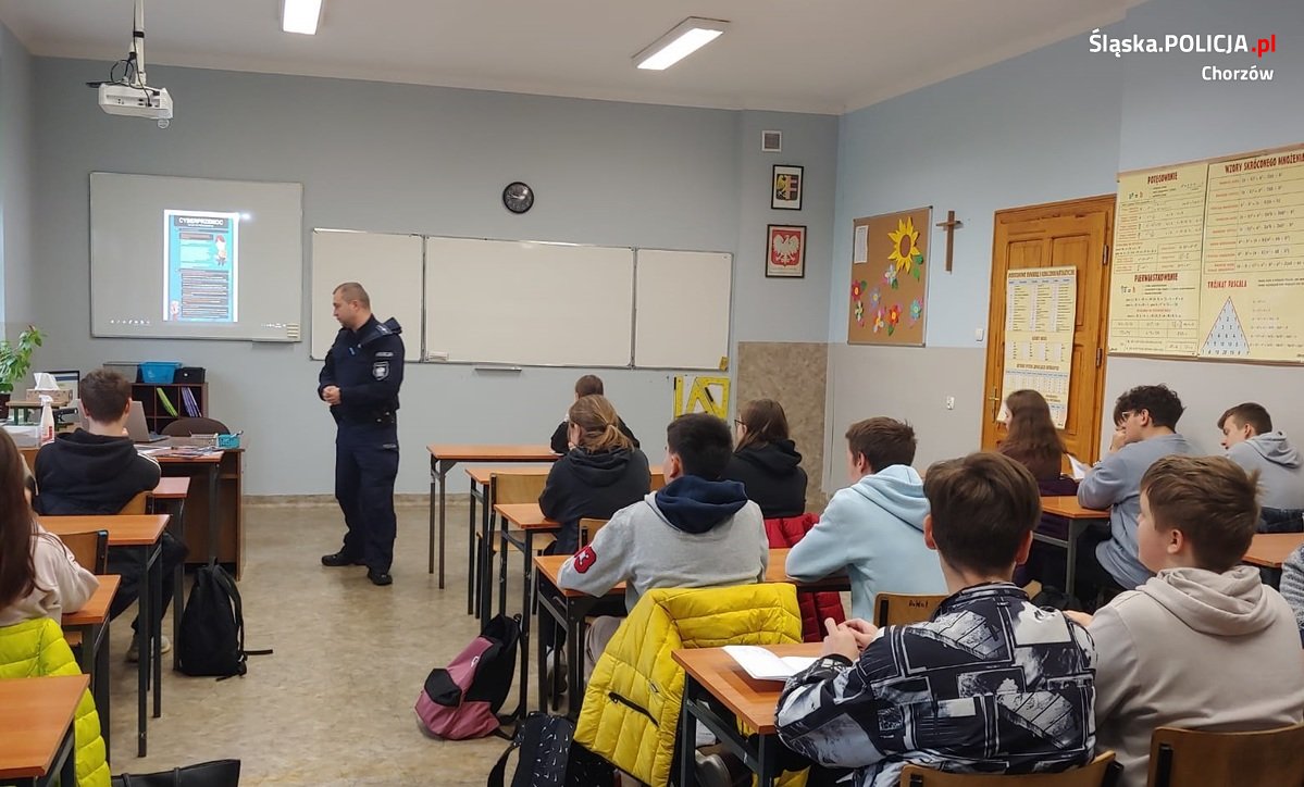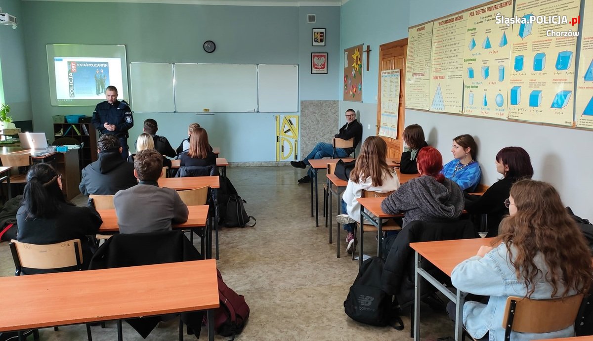 Chorzowscy policjanci zajmujący się działaniami w zakresie profilaktyki społecznej przeprowadzili szereg niezwykle ciekawych zajęć dla młodzieży z Zespołu Szkół Gastronomiczno- Usługowych im. Marii Dąbrowskiej w Chorzowie. Ich celem było przybliżenie uczniom pojęcia „Handlu Ludźmi”, charakterystyki tego zjawiska, wskazanie grup ryzyka, formy wykorzystania, sposobu działania sprawców takich przestępstw. Zwrócono również uwagę na uprawnienia ofiar Handlu Ludźmi. Policjanci przedstawili dodatkowo zagrożenia związane z przestępstwami w cyberprzestępczości oraz czynów określanych jako „Mowa nienawiści”. Zwrócono również uwagę na zagrożenia związane z przestępczością narkotykową. Spotkanie z młodzieżą miało na celu pogłębienie wiedzy w prezentowanym zakresie, zmianę wyobrażenia młodzieży w kwestii wymienionych zagrożeń, sposobu unikania sytuacji niebezpiecznych. Na zakończenie policjanci przedstawili charakter służby policjanta oraz funkcjonowania całej formacji w Polsce. Zajęcia cieszyły się ogromnym zainteresowaniem, a młodzież zadawała policjantom szereg pytań. Spotkanie edukacyjne było okazją do promowania służby w Policji i zachęcania młodych ludzi do wyboru tego zawodu.