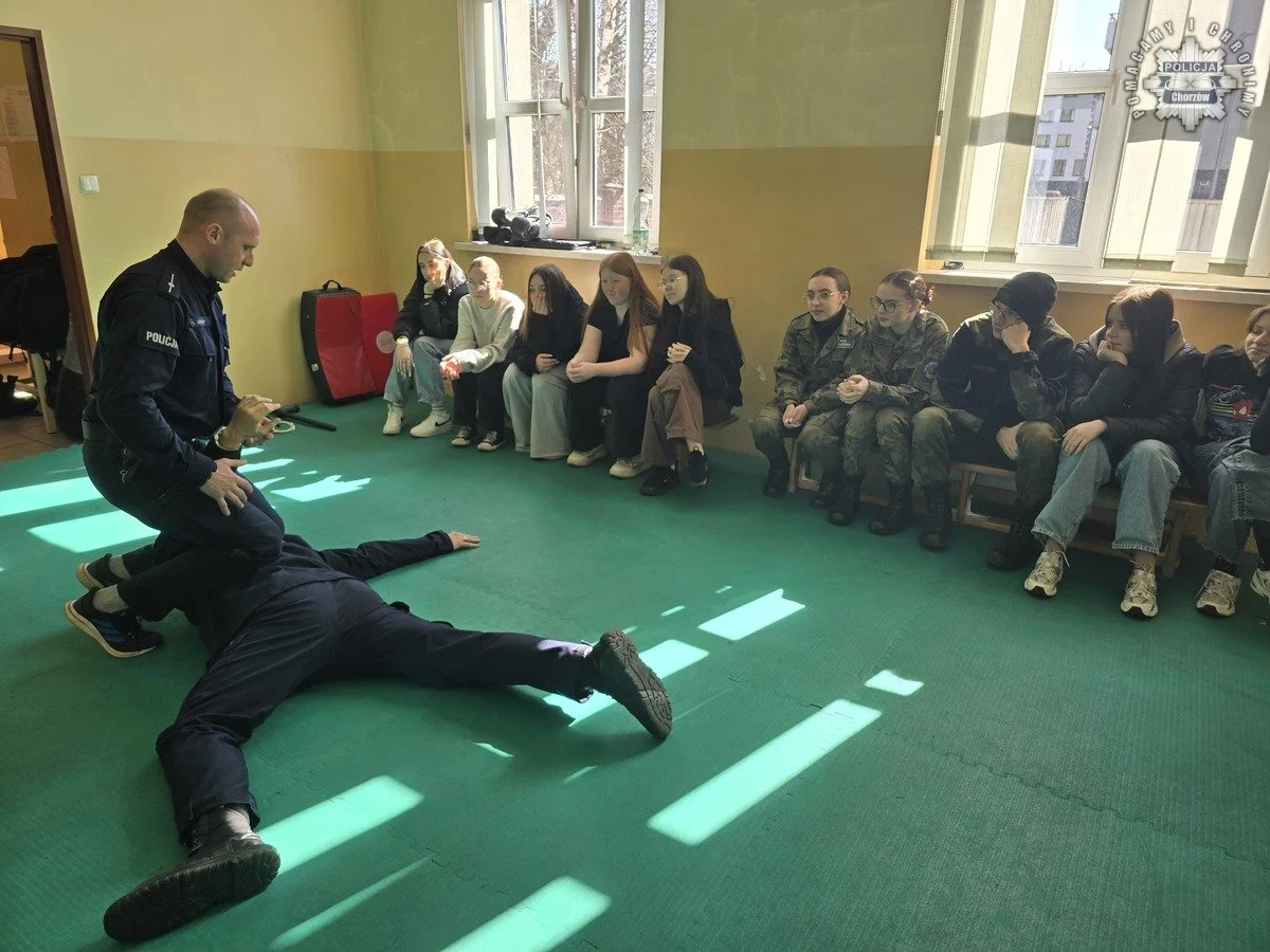 Ostatnią z przygotowanych atrakcji był pokaz technik i taktyk interwencji przeprowadzony przez młodszego aspiranta Łukasza Granicznego, który jest odpowiedzialny za doskonalenie umiejętności chorzowskich policjantów. Uczniowie zobaczyli poszczególne środki przymusu bezpośredniego wykorzystywane najczęściej przez policjantów, poznali też techniki kajdankowania czy obezwładniania osób.