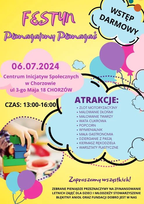 W sobotę 6 lipca na terenie Centrum Inicjatyw Społecznych zlokalizowanego w Chorzowie przy ulicy 3-go maja 18 od godziny 13:00 do 16:00 odbywać się będzie festyn Pomagajmy Pomagać. Udział w wydarzeniu jest bezpłatny, a zebrane pieniądze zostaną przeznaczone na sfinansowanie letnich zajęć dla dzieci i młodzieży będących podopiecznymi Stowarzyszenia Błękitny Anioł oraz fundacji Dobro Jest w Nas.
