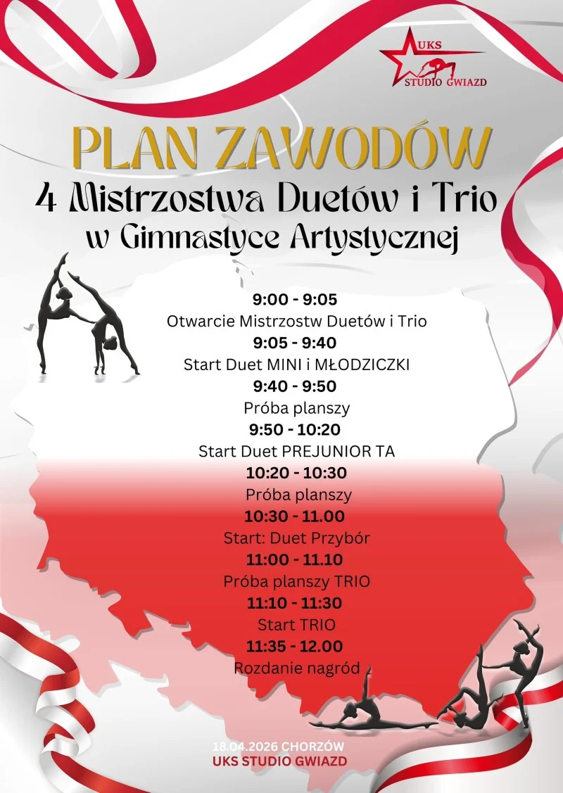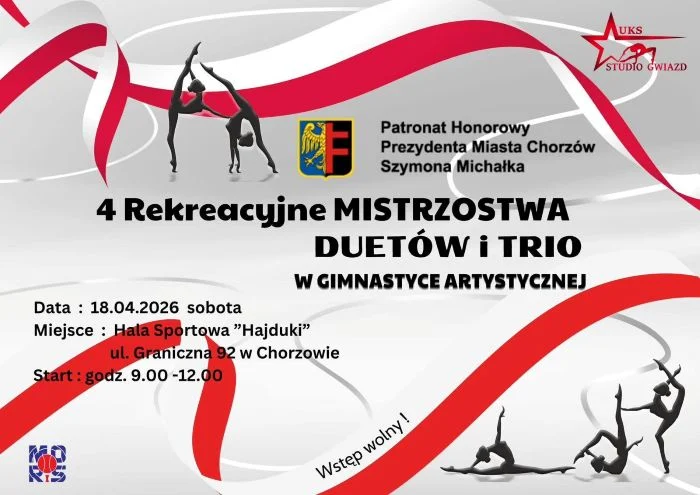 Jak informuje MORiS Chorzów, gospodarzem sobotnich wydarzeń będzie hala Kompleksu Sportowego „Hajduki” przy ul. Granicznej 92. Organizatorzy zapowiadają dzień wypełniony nie tylko sportową rywalizacją, ale też pięknymi choreografiami, wyjątkową atmosferą i dużą dawką emocji.