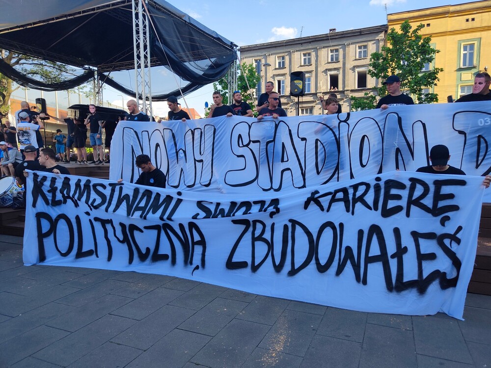 “Grabarze miasta won!” – pod takim hasłem odbył się dzisiejszy protest sympatyków Ruchu Chorzów, którzy w centrum miasta manifestowali swoje niezadowolenie z powodu wciąż nierozpoczętej budowy nowego stadionu przy ul. Cichej.