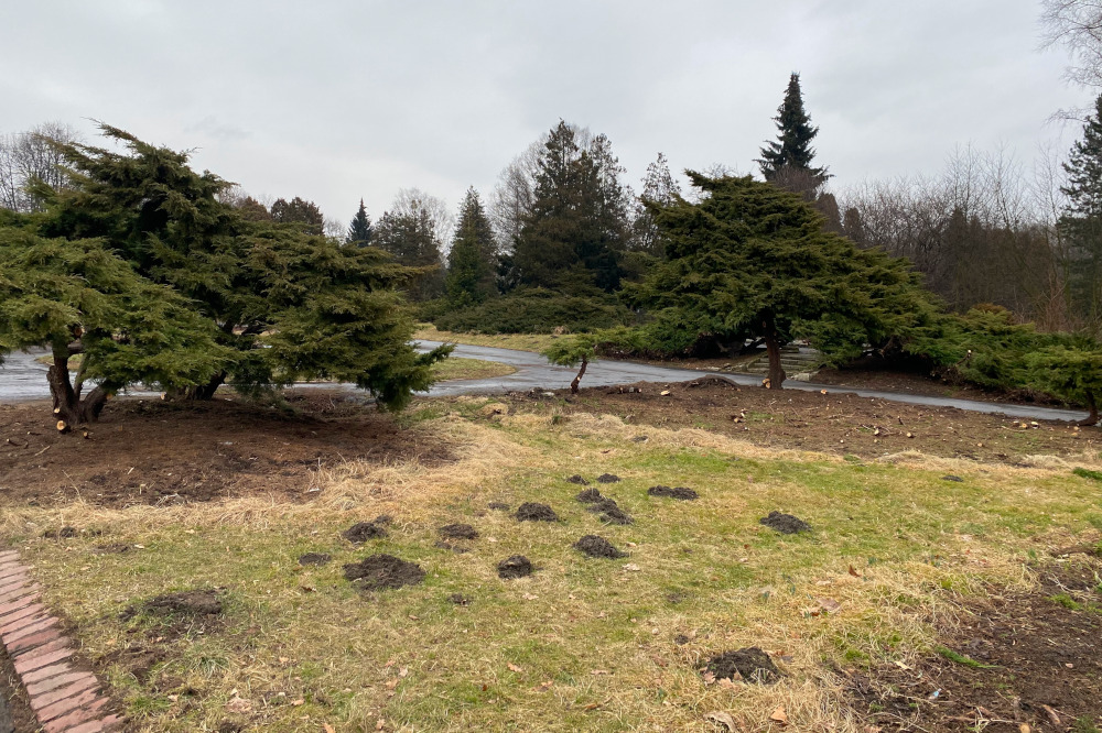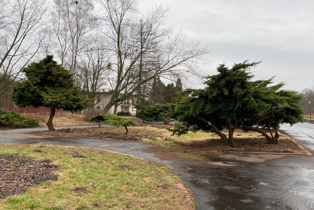 Ruszyliśmy w teren i postanowiliśmy sprawdzić na miejscu, jak faktycznie wygląda sytuacja. Naszym oczom ukazał się dość zaskakujący widok – stopień regulacji iglaków jest mocno zaawansowany i ingerujący w tkankę krzewów, co potwierdzają zdjęcia w galerii, wykonane w piątek 17 lutego. Prace tego dnia zatrzymały się na 2/3 długości odcinka promenady wzdłuż Dużego Stawu – na podcięcie czekały wiekowe nasadzenia bliżej Alei Głównej (do rzeźby Pelikanów). Intensywne podcinanie dotknęło również jałowce i iglaki w części Ogrodu Bylinowego w pobliżu stawu Perkoz.