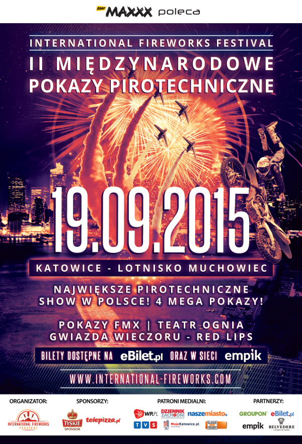 19 września na terenie lotniska Muchowiec w Katowicach odbędzie się druga edycja jednego z największych i najpiękniejszych festiwali sztucznych ogni w Europie. Podczas imprezy zobaczymy aż cztery piękne i widowiskowe spektakle pirotechniczne, niesamowita muzyka, wyjątkowe efekty wizualno- laserowe, teatr ognia oraz koncerty w tym gwiazda wieczoru zespół RED LIPS – to wszystko już 19 września 2015 roku w Katowicach.