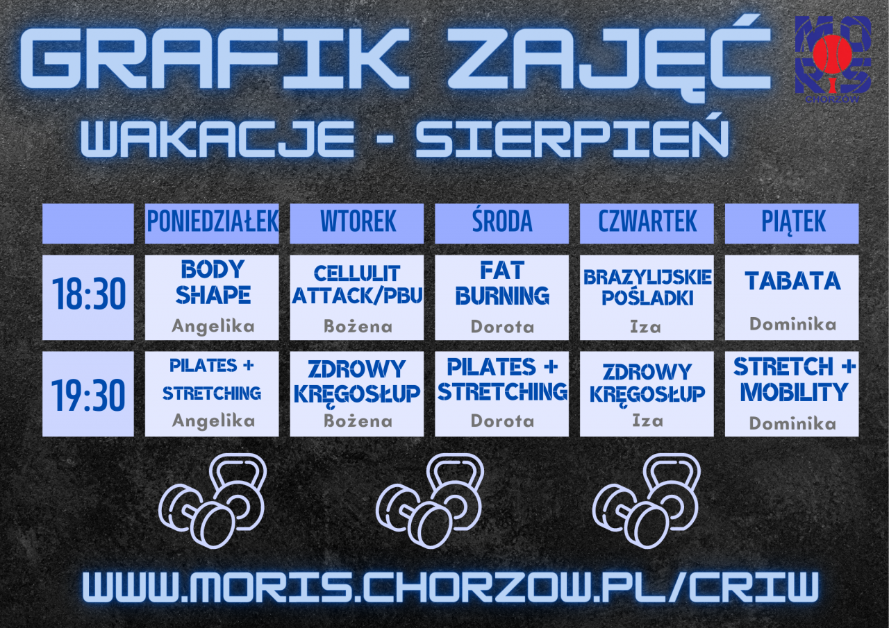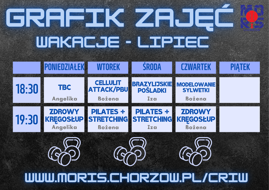 W Centrum Rekreacji i Wdzięku chorzowskiego MORiSu w lipcu i sierpniu będą odbywały się zajęcia fitness. Zajęcia prowadzi wykwalifikowana kadra Instruktorek. W hali MORiS przy ul. Dąbrowskiego 113 będzie również możliwość skorzystania z siłowni, sauny oraz stołu do tenisa stołowego. Na zajęcia trzeba się wcześniej zapisać – TUTAJ.