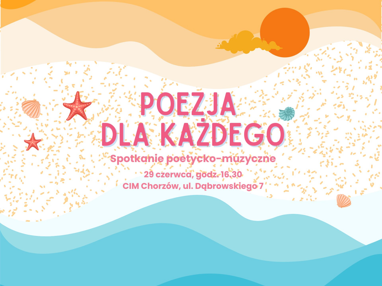 W czwartek 29 czerwca o godzinie 16.30 w Centrum Integracji Międzypokoleniowej odbędzie się kolejne spotkanie poetycko-muzyczne „Poezja dla każdego”. Jego celem jest zainspirowanie i zachęcenie osób do odkrywania i tworzenia poezji. Podczas spotkania uczestnicy będą mieli okazję zaprezentować swoje własne wiersze, a także wysłuchać wierszy innych autorów. Wydarzenie to jest także doskonałą okazją do rozmów i dyskusji na temat poezji oraz do poznania podobnie myślących osób.