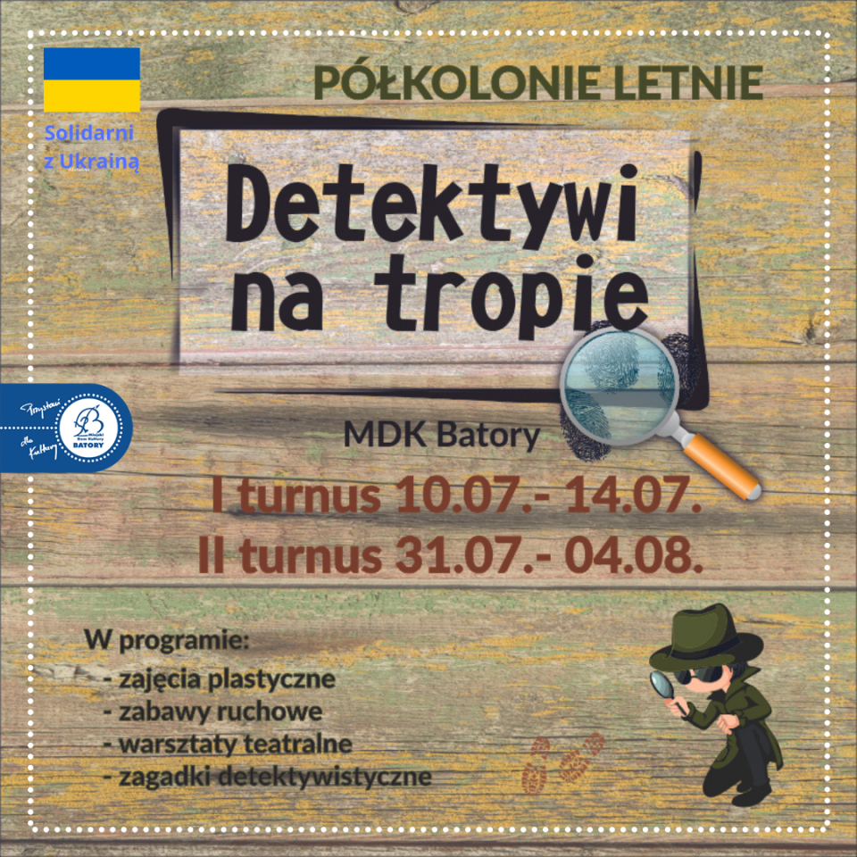 Chorzowski MDK Batory zaprasza dzieci w wieku od 7 do 12 lat do wspólnej zabawy podczas półkolonii letnich. W tym roku dzieci będą miały okazję zabawić się w tajemniczych detektywów, szukających odpowiedzi na wiele nurtujących pytań. Dzieci będą brać udział w warsztatach teatralnych, zajęciach plastycznych i ruchowych.