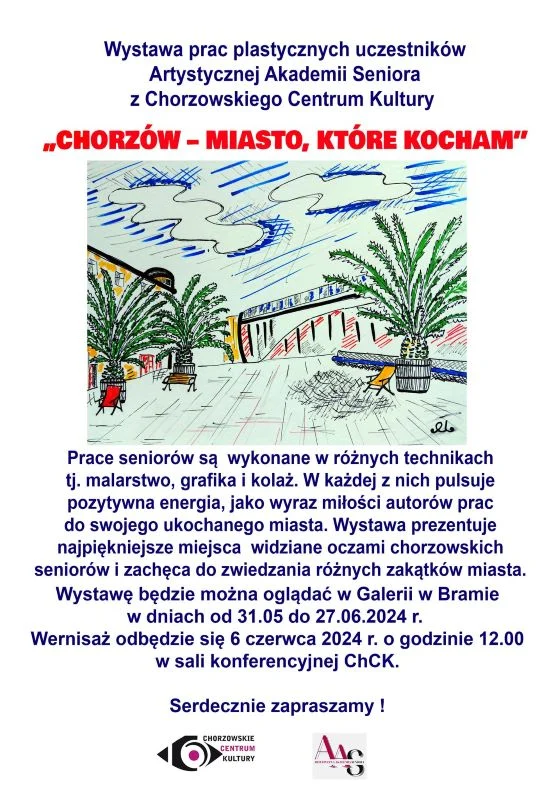 Już 6 czerwca o godzinie 12:00 w sali konferencyjnej Chorzowskiego Centrum Kultury odbędzie się wernisaż wystawy pt. „Chorzów – miasto, które kocham”. Na wystawie zostaną zaprezentowane prace plastyczne uczestników Artystycznej Akademii Seniora.