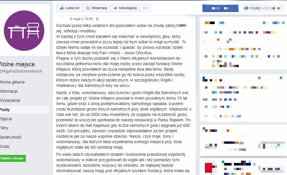 Pragnę w tym duchu podzielić się z Wami oficjalnym komentarzem do wycofania pełnomocnictw dla mojej osoby przez zarząd fundacji Wolne Miejsce, którą powołałem do życia niespełna dwa lata temu. Będę wdzięczny za cierpliwe przeczytanie go do końca przez wszystkie osoby, którym dobro naszych akcji społecznych, w szczególności Wigilii i Wielkanocy dla Samotnych leży na sercu.