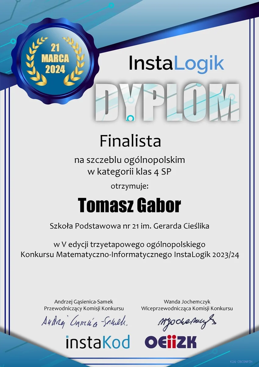 Tomasz Gabor z klasy 4b został finalistą V edycji trzyetapowego ogólnopolskiego Konkursu Matematyczno-Informatycznego Instalogik 2023/24. To niezwykłe osiągnięcie, które podkreśla wysoką jakość edukacji i zaangażowanie uczniów w rozwijanie swoich umiejętności.