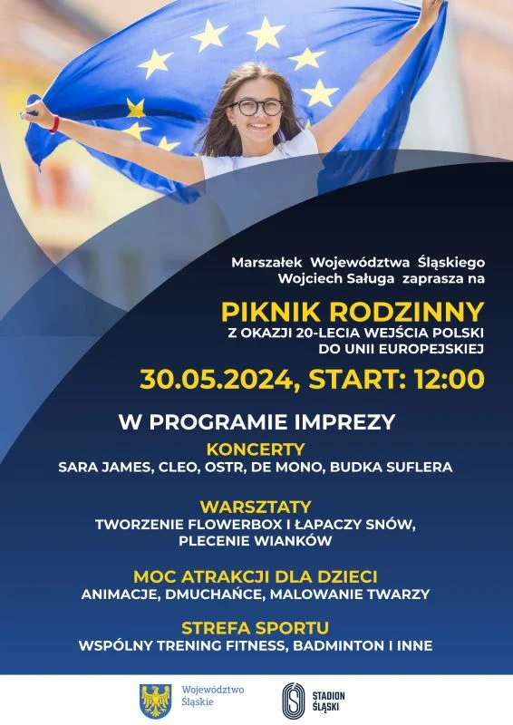 Start Pikniku Rodzinnego z okazji 20-lecia wejścia Polski do Unii Europejskiej na Stadionie Śląskim 30 maja 2024 r. o godz. 12.00, a koncertów – o godz. 15.00. Udział w wydarzeniu oraz wszystkich atrakcjach jest darmowy.