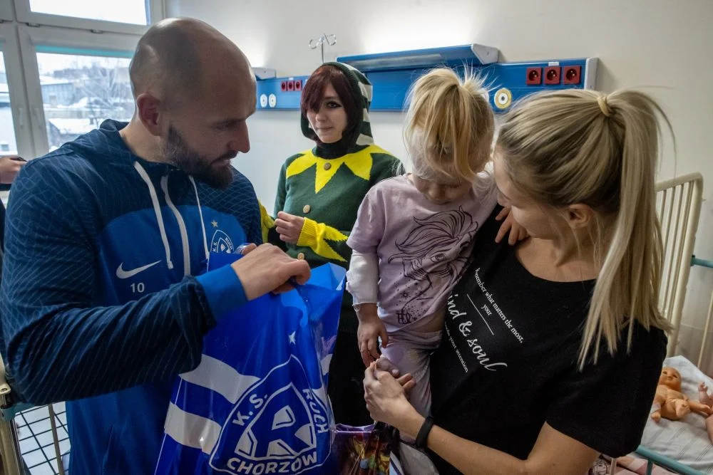 Ciężko słowami oddać to, co wydarzyło się w minioną sobotę w Zespole Szpitali Miejskich. Pod budynek podjechali MotoMikołaje – część z nich na quadach i motocyklach, część w zmotoryzowanych saniach. Towarzyszyli im zawodnicy Ruchu Chorzów: kapitan Tomasz Foszmańczyk, obrońca Maciej Sadlok i bramkarz Jakub Bielecki. Nie zabrakło także postaci z bajek, takich jak Grinch, Myszka Minnie czy Królik Bugs. Wesołą ekipę zasilili również członkowie grupy poszukiwawczo-ratowniczej z psami, które chętnie bawiły się z dziećmi.