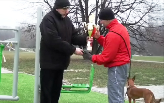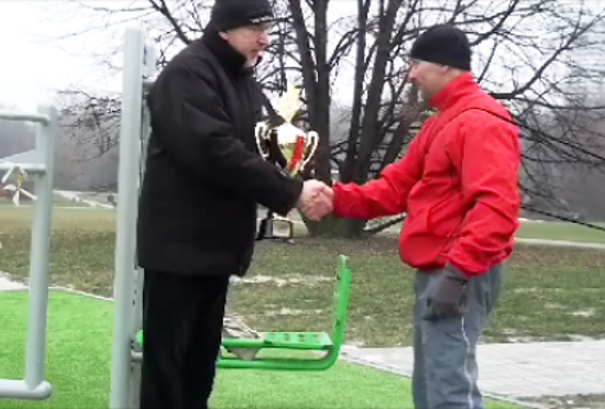 Sympatycy aktywnego spędzania czasu wolnego, mogli skorzystać ze znajdujących się obok Szkieletora urządzeń do ćwiczeń gimnastycznych oraz wziąć udział we wspólnych, z miłośnikami sportów walki, ćwiczeniach. Dla porządku, odnotować należy, iż pierwszym zdobywcą Pucharu Marszałka Województwa Śląskiego, został, widoczny na zdjęciu, pan Rafał Rafa z Siemianowic Śląskich, który może stanowić prawdziwy wzór do naśladowania w staraniach o zdrowie i kondycję fizyczną. Organizatorzy projektu, adresowanego do wszystkich chętnych, osób w różnym wieku, które chcą spędzić miło, pożytecznie, a przede wszystkim aktywnie, czas wolny, w Parku Śląskim, zapraszają, już w najbliższą sobotę, tj. 12 Stycznia 2013 roku, na godzinę 10.30, pod budynek Szkieletora, gdzie będzie można wziąć udział w drugiej edycji zimowych konkurencji sportowo-rekreacyjnych.