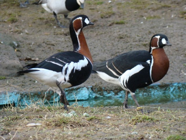 Te piękne, kontrastowo ubarwione ptaki nie były wczesniej prezentowane w naszym Ogrodzie. W naturze gatunek ten zamieszkuje tundrę zachodniej Syberii, a zimuje na wybrzeżach Morza Kaspijskiego i Zatoki Perskiej. Sporadycznie obserwowany jest także w Europie. Bernikle rdzawoszyje są roslinożerne, żerują w płytkiej wodzie i na lądzie. Gniazdują w małych grupach. W ciagu roku wyprowadzają 1 lęg. Jaja wysiaduje samica, lecz samiec pomaga jej w opiece nad potomstwem. Z powodu znacznego spadku ich liczebności w ostatnich latach, bernikle rdzawoszyje uzyskały status gatunku zagrożonego wyginięciem. Są również objęte Konwencją Waszyngtońską.