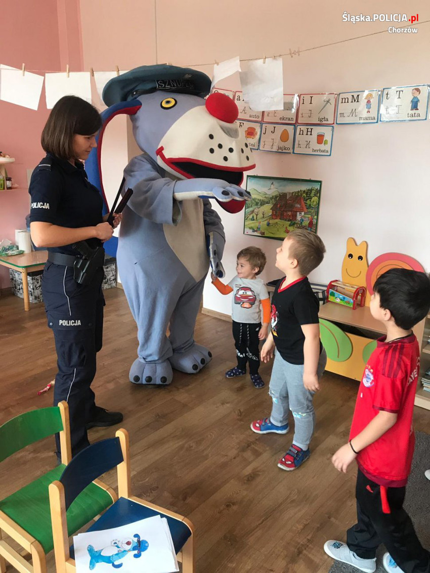 Policjantka z Zespołu Profilaktyki Komendy Miejskiej Policji w Chorzowie st. post Dagmara Białach spotkała się z przedszkolakami jednego z chorzowskich przedszkoli.  Podczas wizyty policjantka  przedstawiła milusińskim jak na co dzień wygląda praca policjanta oraz przypomniała o zasadach bezpiecznego poruszania się po drogach i konieczności noszenia odblasków po zmroku. Mundurowa uczyła dzieci, jak należy się zachowywać w różnego rodzaju  sytuacjach zagrożenia. Przypomniała również numery telefonów alarmowych do służb ratowniczych. Główną atrakcją spotkania była policyjna maskotka Sznupek. Każde dziecko mogło także z bliska zobaczyć elementy wyposażenia policjanta jak i zrobić sobie pamiątkowy odcisk dłoni. Na koniec dzieci otrzymały odblaski.