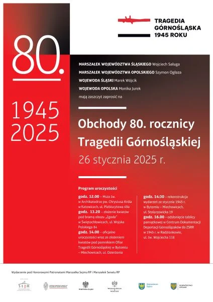 – Tragedia Górnośląska wciąż jest nieodkrytą kartą w naszej historii, przez lata ukrywaną i odsuwaną w cień, a naszym obowiązkiem jest przypominanie o tych dramatycznych wydarzeniach, szczególnie młodym ludziom i oddanie należnego hołdu ofiarom i ich bliskim. To część naszej tożsamości i pamięci historycznej, dlatego już dziś zapraszam wszystkich mieszkańców do udziału w obchodach 80. Rocznicy Tragedii Górnośląskiej – podkreśla marszałek Województwa Śląskiego, Wojciech Saługa.