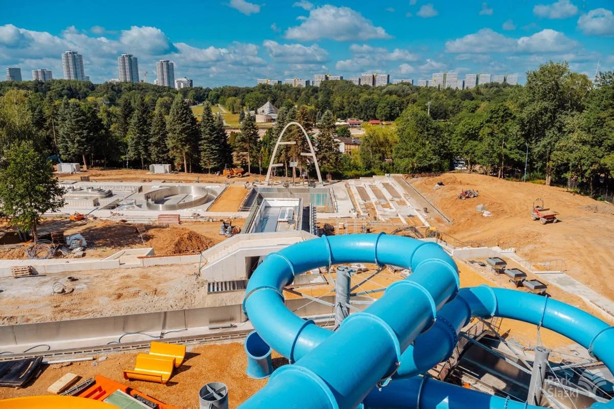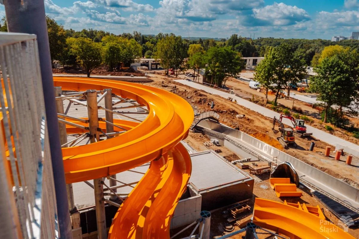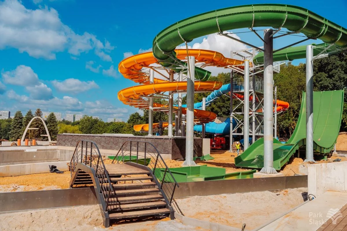 Budowa nowego kąpieliska Fala w Parku Śląskim idzie pełną parą. Spacerując alejami parkowymi już z oddali widać kolorowe zjeżdżalnie, które już zamontowano na terenie przyszłego kąpieliska. Zaawansowanie robót związanych właśnie z tymi elementami wraz z wieżą startową osiągnęło już 85 proc.