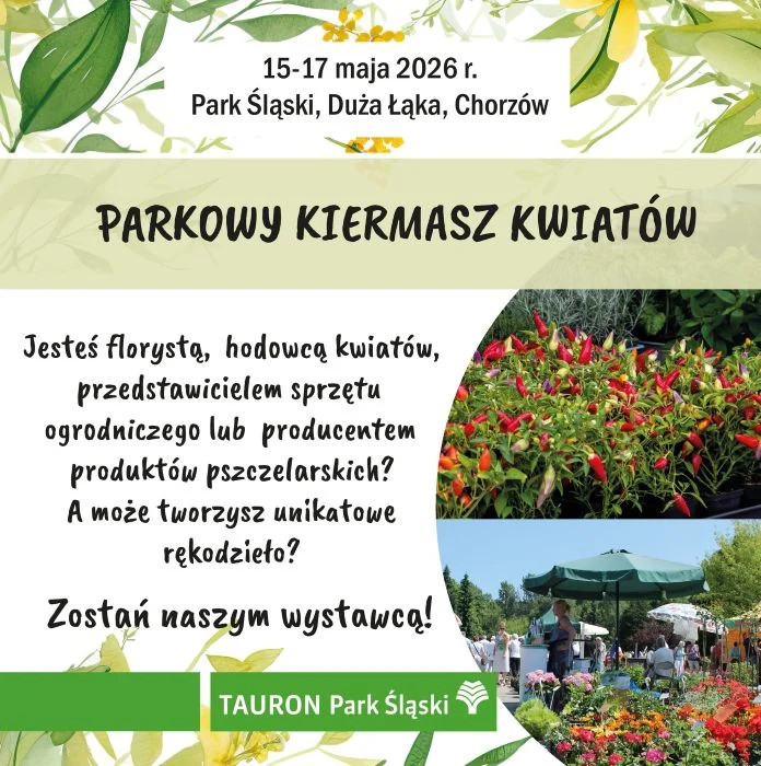 TAURON Park Śląski w Chorzowie zaprasza wystawców na Parkowy Kiermasz Kwiatów. Wydarzenie odbędzie się 15–17 maja 2026 roku na Dużej Łące.