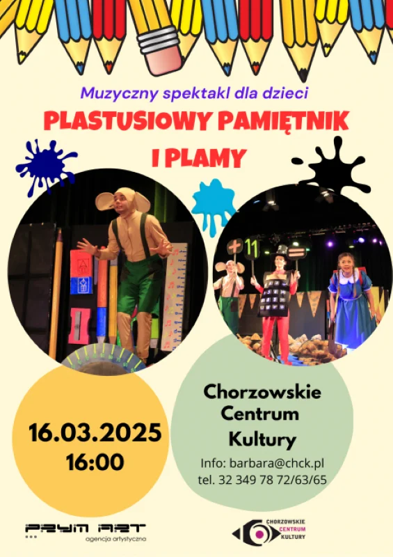 Już 16 marca o godzinie 16:00 w Chorzowskim Centrum Kultury odbędzie się wyjątkowy spektakl dla dzieci – „Plastusiowy Pamiętnik” oraz „Plamy”, przygotowany przez Prym Art. To wspaniała okazja, by przenieść się do magicznego świata Plastusia, plastelinowego ludzika, który zabiera Tosię do piórnikowego uniwersum pełnego przyborów szkolnych.