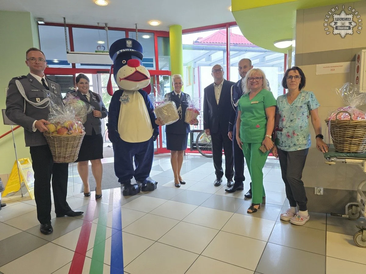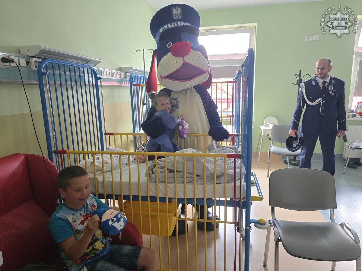 Policjanci, oprócz stoiska profilaktycznego, odwiedzili także dzieci na oddziałach chirurgii i alergologii Zespołu Szpitali Miejskich w Chorzowie. Funkcjonariusze obdarowali pacjentów drobnymi upominkami, w tym sokami, owocami, słodyczami i maskotkami. Wizytę w szpitalu uświetnił Sznupek, który szybko zdobył serca maluchów. Takie spotkania były miłym oderwaniem od trudów leczenia.