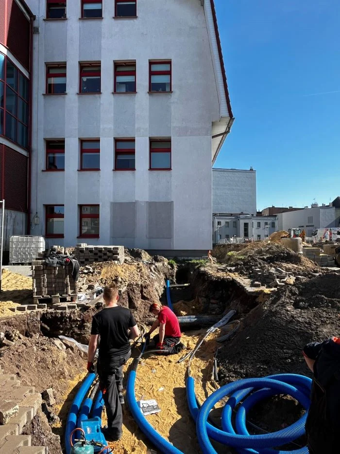 Za szpitalem dziecięcym przy ul. Truchana mamy plac budowy z prawdziwego zdarzenia! Trwają intensywne prace nad budową budynku poradni specjalistycznych.
