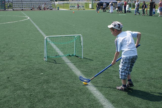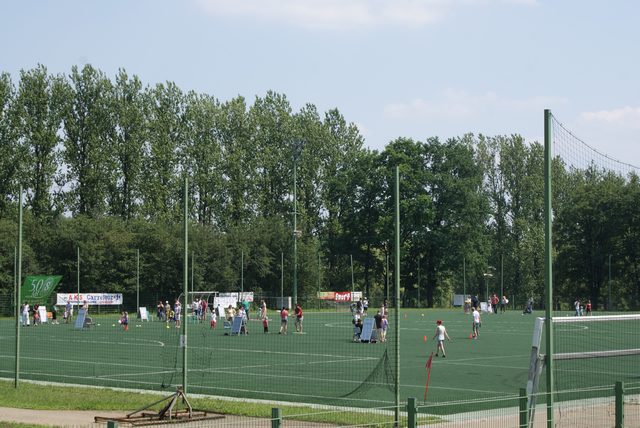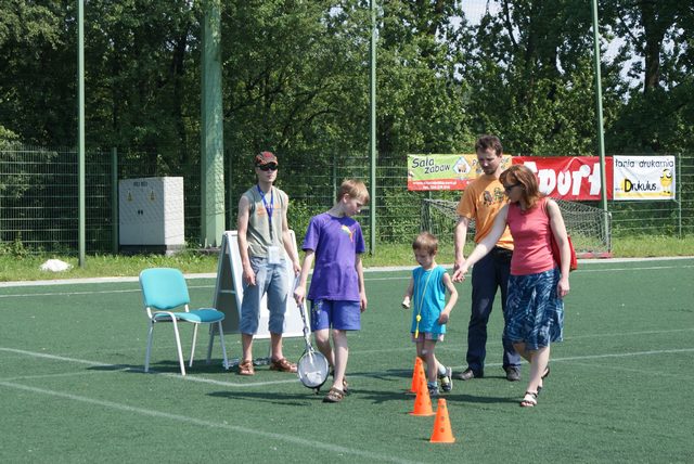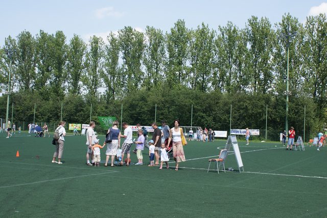 Na boisku treningowym ze sztuczną nawierzchnią przedszkolaki mogły się sprawdzić w specjalnie przygotowanych konkurencjach, w części z nich musieli także wystartować dorośli: