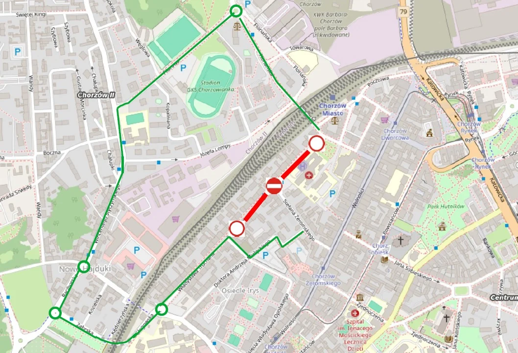 Objazd od ul. Sienkiewicza w kierunku ul. Żeromskiego będzie się odbywał ulicami: Floriańską, Filarową, Styczyńskiego, Raciborską, Zabrską, Głogowską, Strzelców Bytomskich, Truchana, Chrobrego i Mielęckiego. Natomiast dojazd do ul. Sienkiewicza będzie się odbywał ulicami: Strzelców Bytomskich, Głogowską, Zabrską, Raciborską, Styczyńskiego , Filarową i Floriańską.