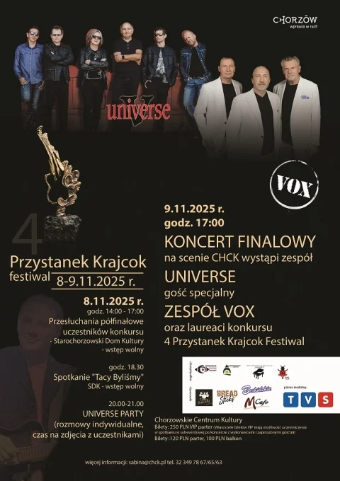 Już 9 listopada w Chorzowskim Centrum Kultury odbędzie się finał IV Przystanku Krajcok Festiwal. Na scenie wystąpią Universe, VOX i laureaci konkursu. Czeka nas wieczór pełen hitów i emocji!