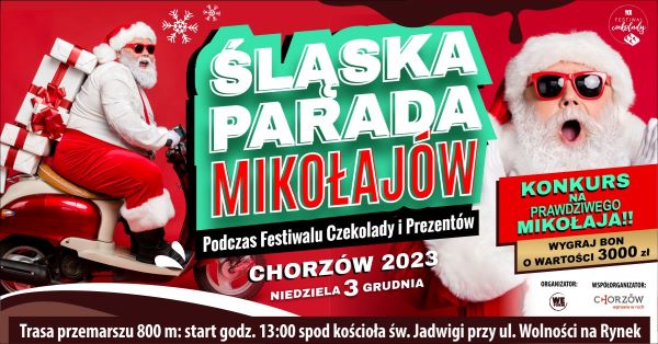 Największa Parada Mikołajów i Mikołajek w województwie śląskim odbędzie się 3 grudnia o godzinie 13:00 w Chorzowie. Podczas parady na uczestników czeka przemarsz spod kościoła Św. Jadwigi przy ul. Wolności na chorzowski rynek. Trasa obejmuje 800 metrów i zakończy się wyłonieniem spośród zgłoszonych uczestników prawdziwego Mikołaja. Osoby biorące udział w paradzie nie muszą posiadać kompletnego przebrania Mikołaja. Wystarczy czerwona czapka lub inny akcent nawiązujący do jego legendy.