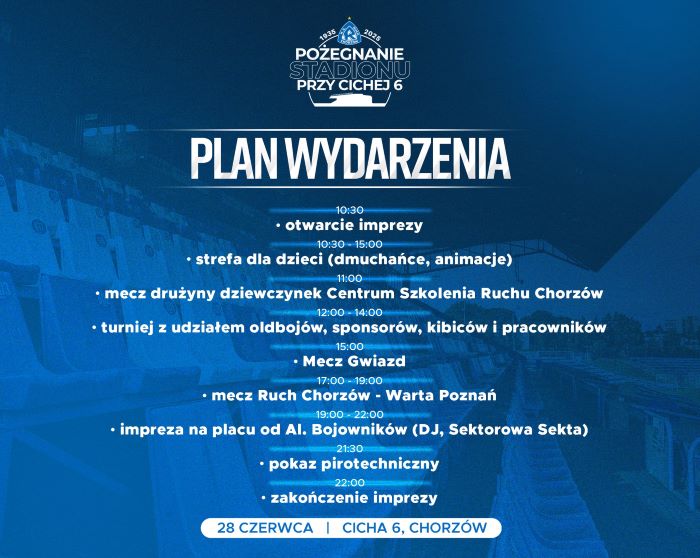 Mieszkańcy Chorzowa oraz wszyscy kibice Ruchu Chorzów mają przed sobą wyjątkowe wydarzenie. W sobotę 28 czerwca o godz. 10:30 odbędzie się Pożegnanie Stadionu przy Cichej 6 – miejsca, które od dziesięcioleci stanowi serce sportowego życia miasta.
