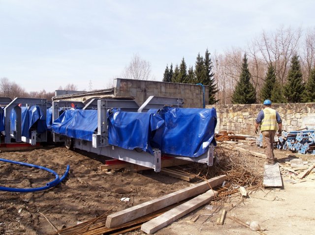 Na trasie stanął już pierwszy słup, zaraz za stacją Stadion Śląski. Kolejne zostaną posadowione za około dwa tygodnie. Na razie robotnicy skręcają je w całość. Każdy z nich ma dwa lub trzy elementy. Na zakończeniu zostaje natomiast zamocowana poprzeczka.
