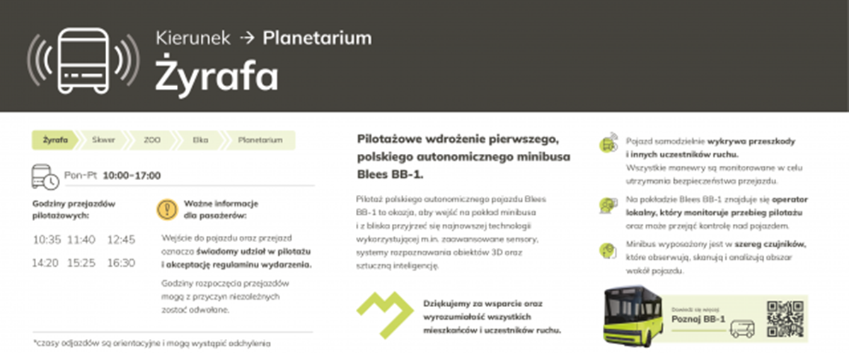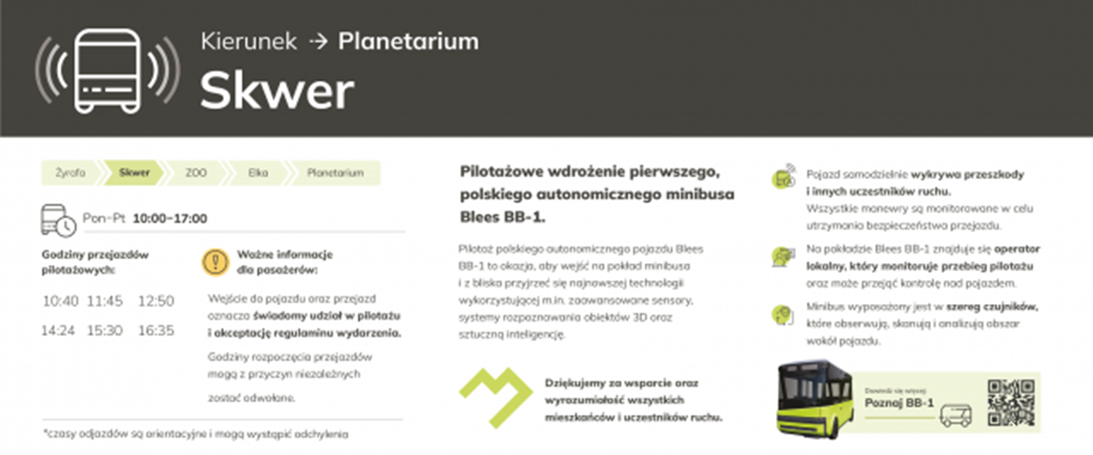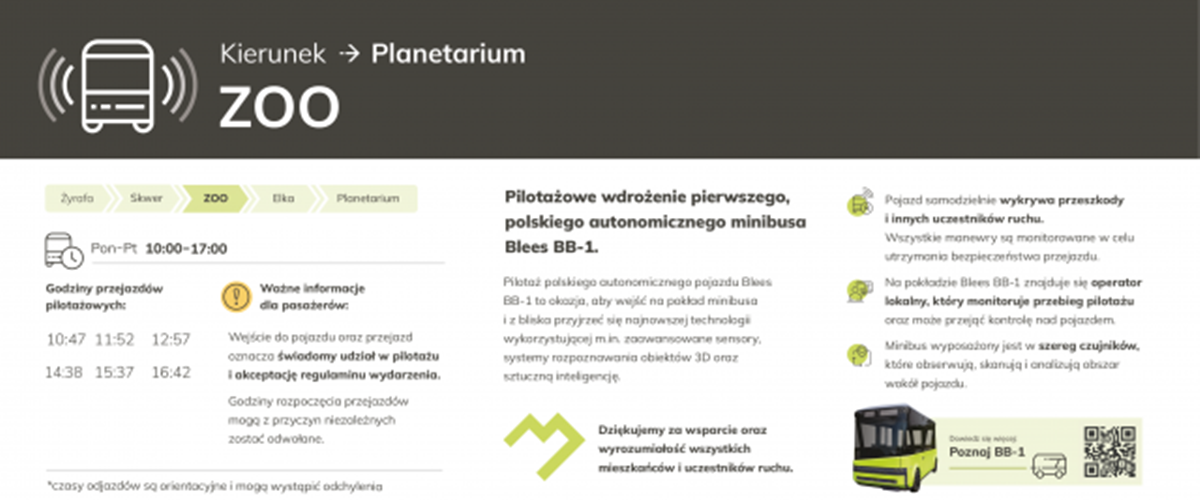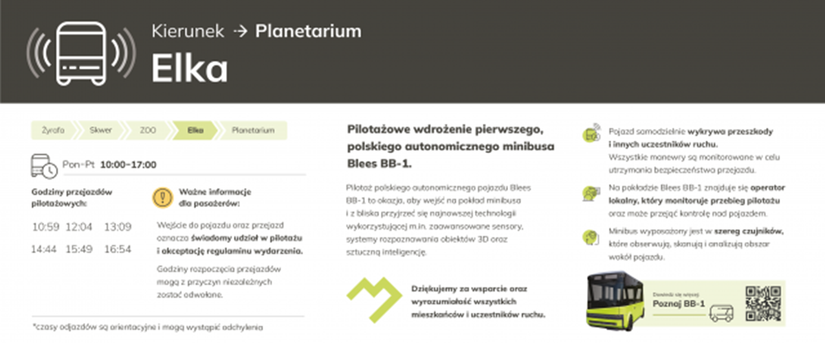 Od 13 czerwca do 24 czerwca br. mieszkańcy i odwiedzający Park Śląski będą mieli okazję doświadczyć przyszłości transportu dzięki pilotowemu programowi autonomicznego minibusa Blees BB-1. Ten innowacyjny pojazd będzie kursował w zmienionych godzinach od poniedziałku do piątku, oferując unikalną możliwość zapoznania się z zaawansowaną technologią autonomicznego transportu.