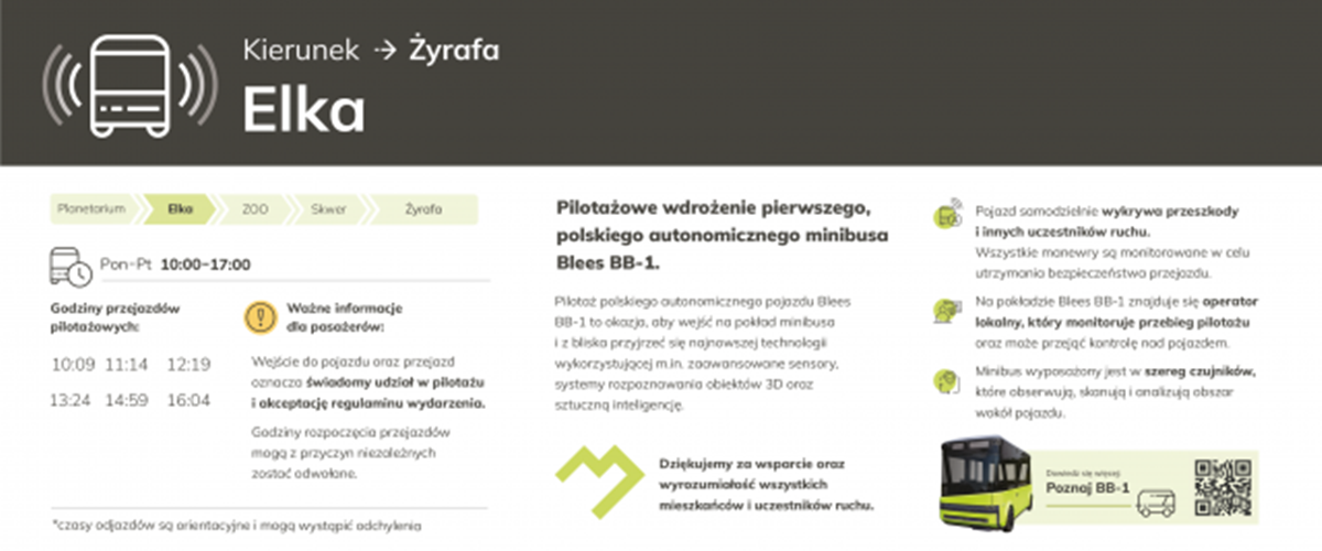 Na pokładzie minibusa znajduje się również operator lokalny, który nie tylko nadzoruje przebieg pilotażu, ale również jest w stanie przejąć kontrolę nad pojazdem w razie konieczności. Wszyscy pasażerowie biorący udział w przejeździe muszą świadomie zaakceptować warunki uczestnictwa oraz regulamin wydarzenia, zapewniającego bezpieczeństwo i komfort podróży.