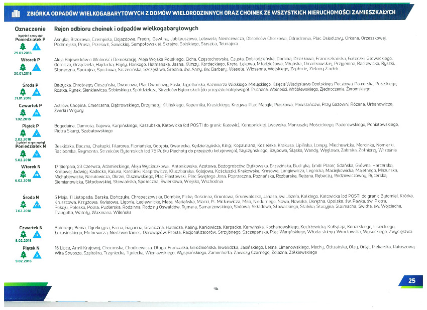 Zbiórka drzewek tradycyjnie rozpocznie się w Chorzowie z końcem stycznia. Między 29.01 a 9.02 w kolejne dni tygodnia choinki będą odbierane według harmonogramu z miejsc przeznaczonych na odpady. Później stare drzewka trafią na kompostownik przy ul. Chorzowskiej. Pełną rozpiskę wywozu oraz spis ulic można znaleźć poniżej oraz w specjalnym kalendarzu, który lada dzień trafi do wszystkich skrzynek pocztowych w mieście. Na każdej stronie obok dat umieszczono kolorowe symbole wskazujące rejon odbioru odpadów oraz ich rodzaj. Na kartach z miesiącami umieszczono także zasady prawidłowej segregacji odpadów. Z kalendarza mieszkańcy mogą dowiedzieć się także w jakich godzinach działa Punkt Selektywnego Zbierania Odpadów Komunalnych SORCIK oraz gdzie i kiedy uruchomiony zostanie jego mobilny odpowiednik.