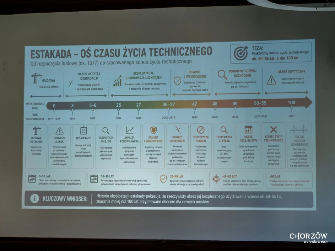Ich wnioski są jednoznaczne: chorzowska estakada znajduje się w stanie przedawaryjnym i powinna zostać rozebrana w ciągu 5 lat. Według ekspertów degradacja obiektu będzie postępować, a dalsze utrzymywanie go jest ekonomicznie nieuzasadnione.